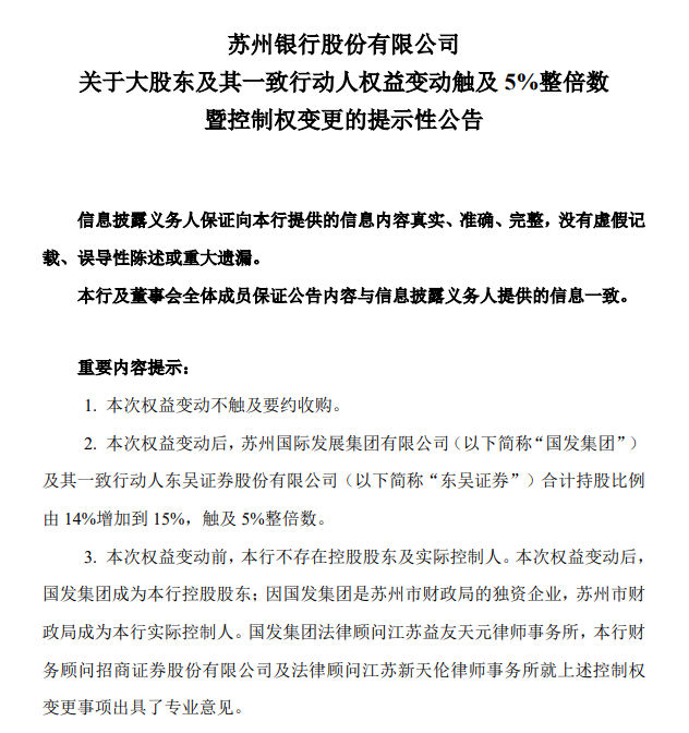 此次权益变动前,苏州银行不存在控股股东及实际控制人。苏州银行称,此次权益变动后,国发集团成为该行控股股东;因国发集团是苏州市财政局的独资企业,苏州市财政局成为该行实际控制人。